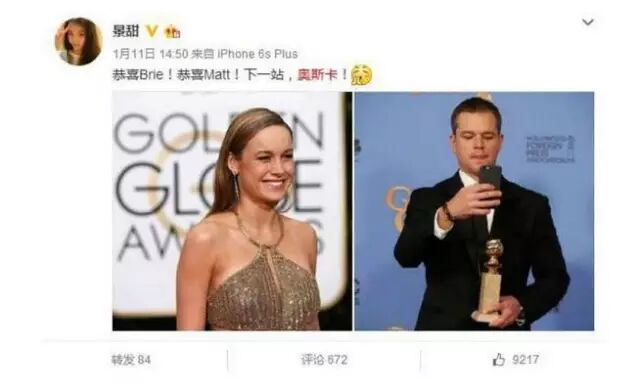 之前奥斯卡提名名单公布时,景甜发了一篇这样的微博: