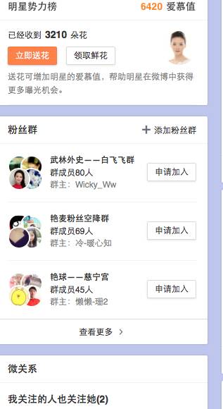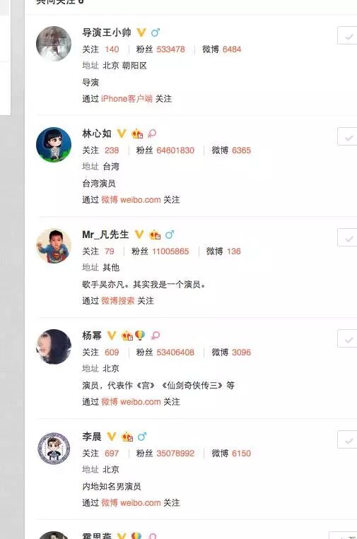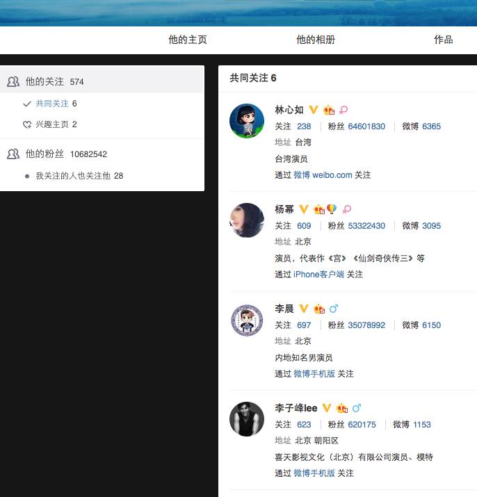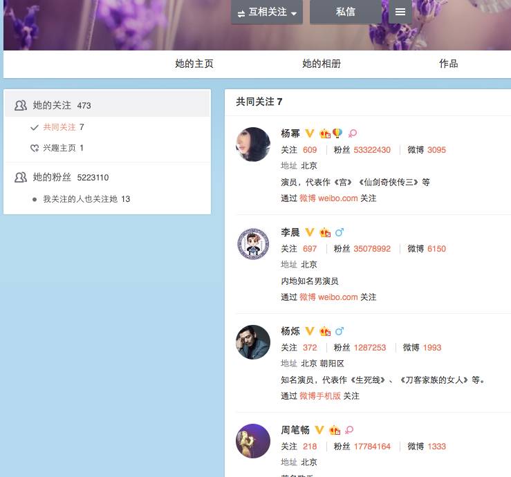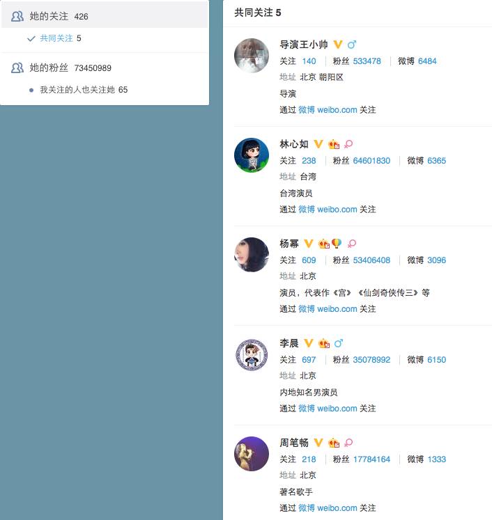 扒爷截取的分别是赵薇、林心如、任泉、古巨基、秦岚、李冰冰、李小冉、王艳的微博,这些人没有一个人跟周杰互粉。