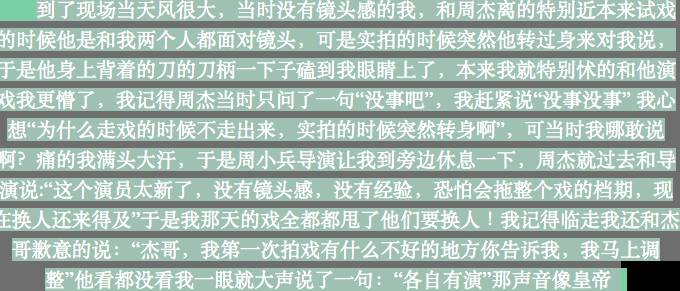 在拍戏的过程中周杰不按照之前走戏的路数来,突然临时转身,撞伤新人的眼睛,还要求导演换掉这个新人。