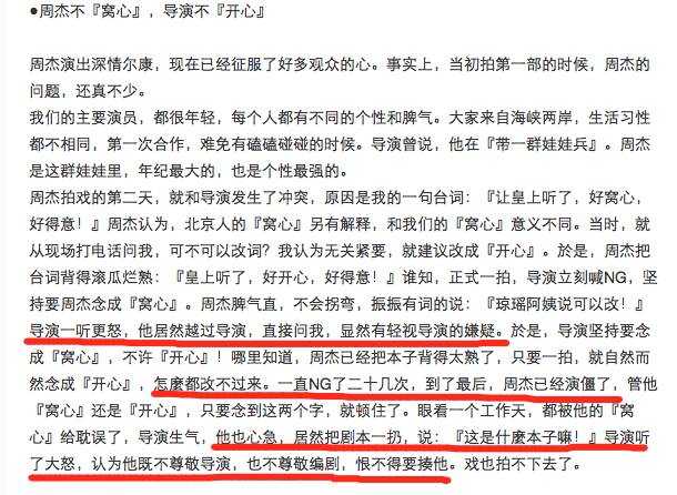 她说周杰越过导演,直接打电话给琼瑶,想把“窝心”改成“开心”,琼瑶同意了,但是导演不知情,在实拍的时候导演因为周杰越权很不开心,就让周杰NG了二十几次,最后周杰直接摔剧本不伺候了!导演当时发火要揍周杰。