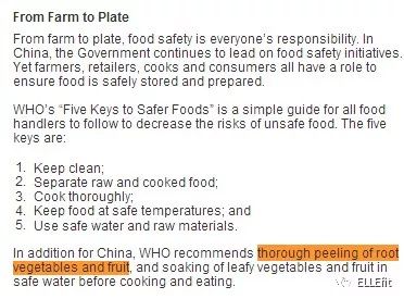 世界卫生组织针对中国建议:对根茎类蔬菜和水果要彻底削皮,叶菜和水果在烹食前要用安全的水浸透。