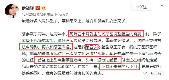 伊能静把自己脸型的变化归功于“整牙”,她每隔四个月就会根据脸型找牙医调整牙套;忍受“颈椎疼痛、头痛、失眠”的困扰。这份意志力,连老编也非常佩服。