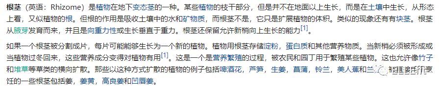 根据维基百科注释,根茎类植物是植物在地下变态茎的一种。某些植物的枝干部分,并不在地面以上生长,而是在土壤中生长,从形态上看,又像植物的根。