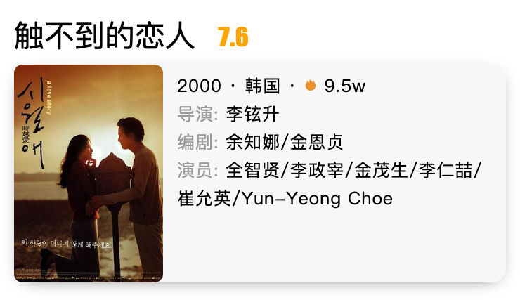 这部电影是典型的韩国爱情片风格,唯美而情绪化,带着一丝心酸和不确定,拨动我们心底最深处的那根几欲忽略的琴弦,一声声呼唤着不轰烈却难忘的爱情。