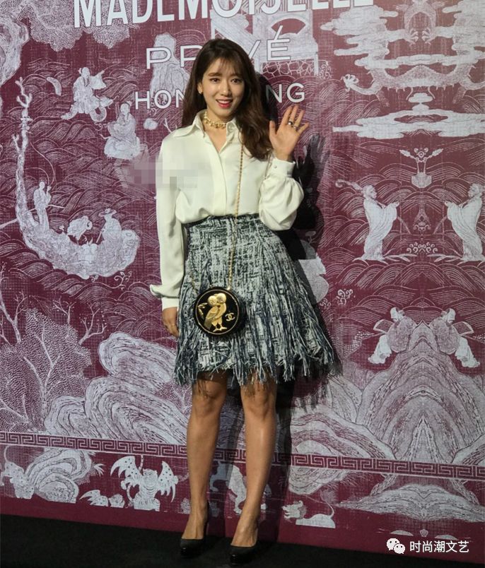 简洁的米白色灯笼袖v领衬衫搭配高腰黑白拼色流苏半身裙,脚踩厚底的黑色高跟鞋,身背黑色圆形链条单肩包的朴信惠带着金色的项链,与包上的金色图案十分的搭配。