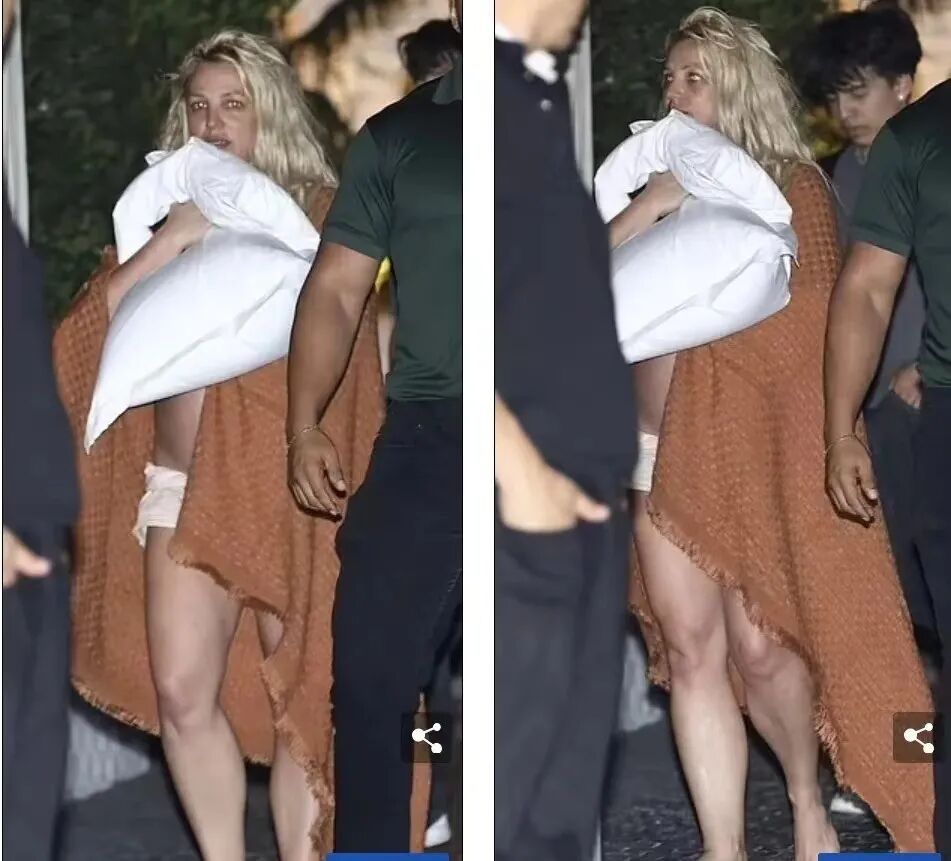 现场流出的照片显示,布兰妮似乎赤裸着上身,只裹了一条土黄色的毯子在身上,下身只穿了一条皱皱巴巴的内裤,连鞋子也没有穿,而且可能是为了遮挡胸部,她一直抱着一个大枕头在胸前,涣散的眼神中透露着惊恐。