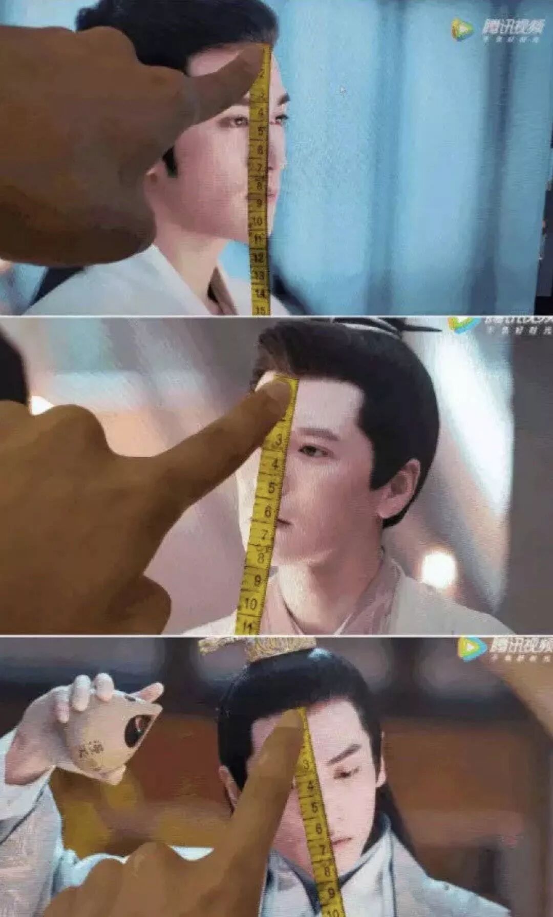 但是,当古装剧的梳画老师把李治廷的刘海全梳上去,再带上紧贴头皮的头套,李治廷的脸自然是“长上加长”,甚至还出现了视觉上的“扭曲”。⬇️⬇️