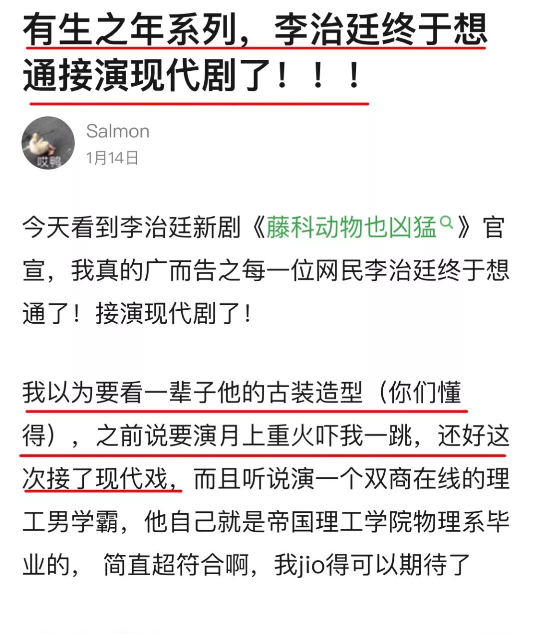 毕竟,李治廷不是没有现代戏拍——瞧!年初接拍现代剧的时候,粉丝挺激动的。⬇️⬇️