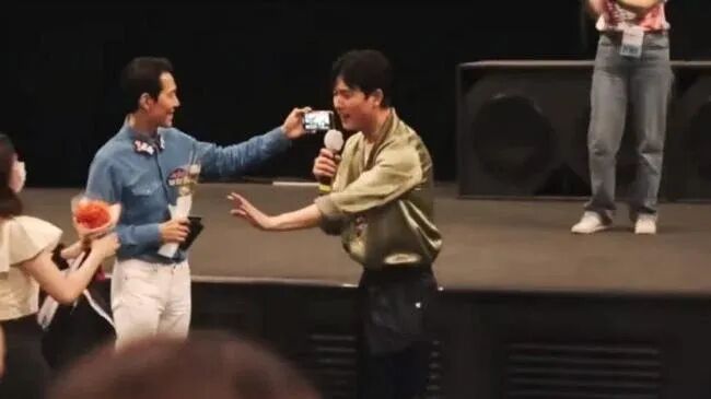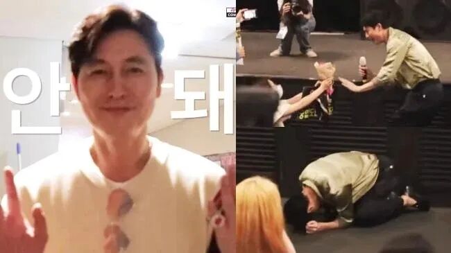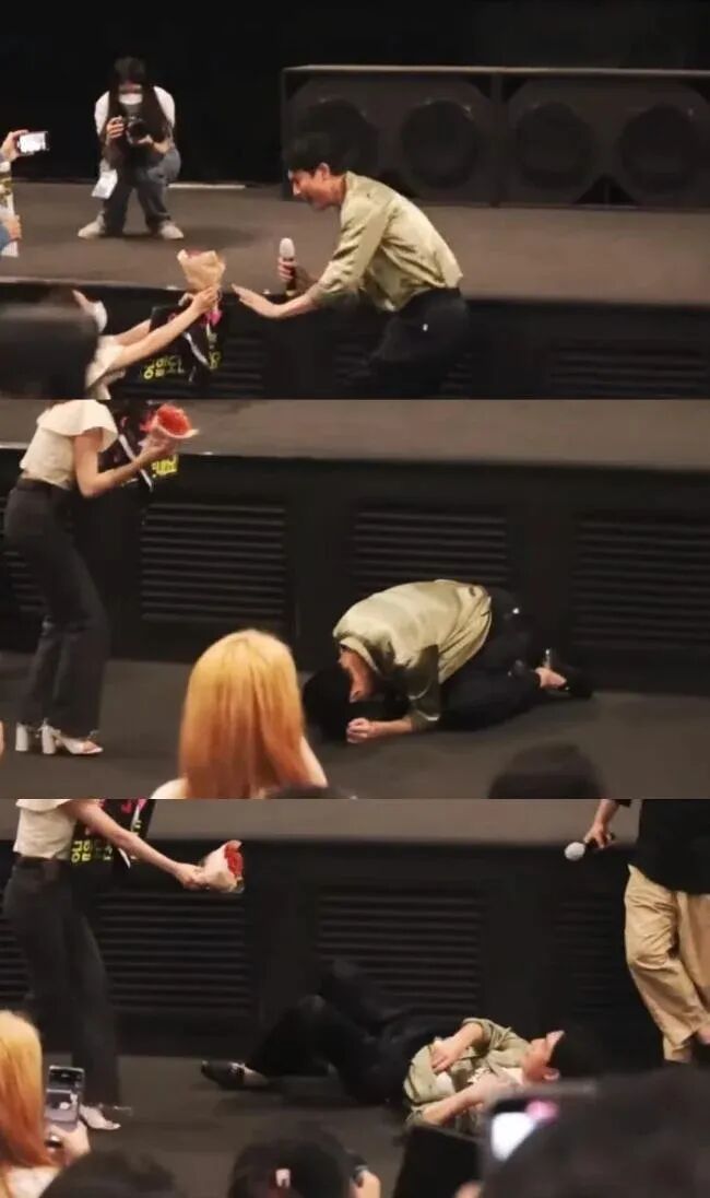 粉丝拿来提前准备的花束走上台,郑雨盛立即摆手:「不可以求婚!」但粉丝十分坚持、直接单膝下跪,郑雨盛也急了,躺在地上用全身表达拒绝:「走开!我不会收的!」不过终究不忍忽视粉丝的心意,挣扎一番后收下了花束。