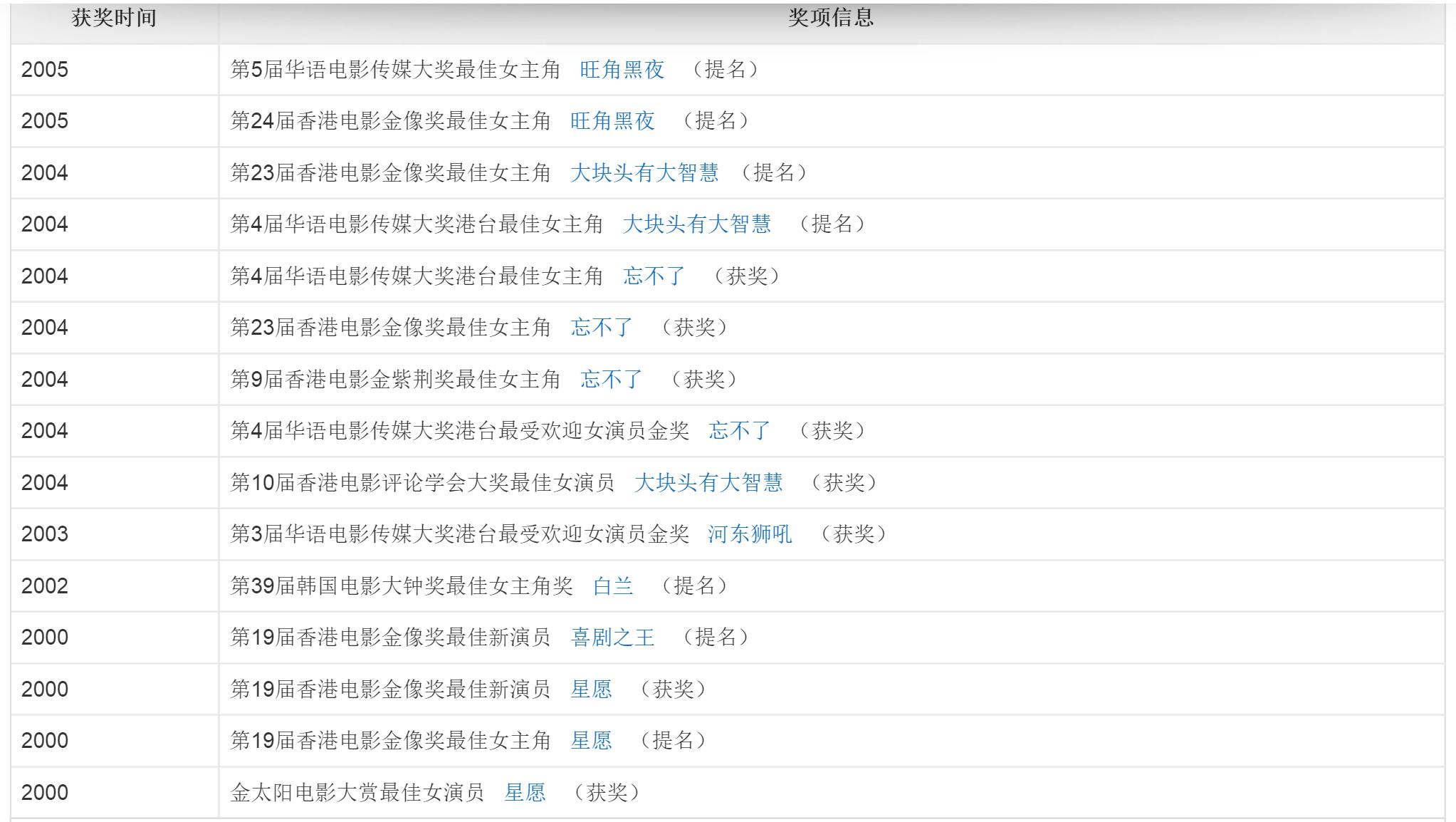 2002年凭借韩国电影《白兰》获得韩国电影大钟奖最佳女主角奖提名,成为首位入围韩国三大电影节的华人影星。