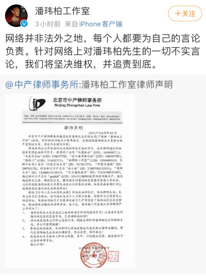 而被实名举报后,潘玮柏、林俊杰的工作室均出来辟谣并发布律师函,表示自己从未有过上述违法行为,这是有人恶意诽谤,将坚决维权并追责到底: