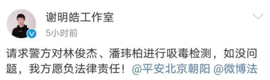 而且说完这句话后,他不仅@了相关警方和禁毒单位,还补充发出了一条微博,这条微博表示:“如果他们没问题,我愿意负法律责任!”