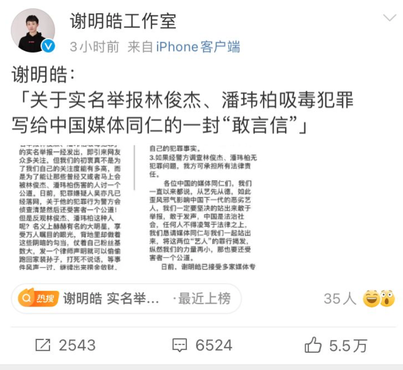 就在今天几个小时前,一位名为谢明皓的演员,就在自己的官方工作室微博上,实名举报了林俊杰、潘玮柏和和吴亦凡一起吸毒,并且还一起强奸幼女!