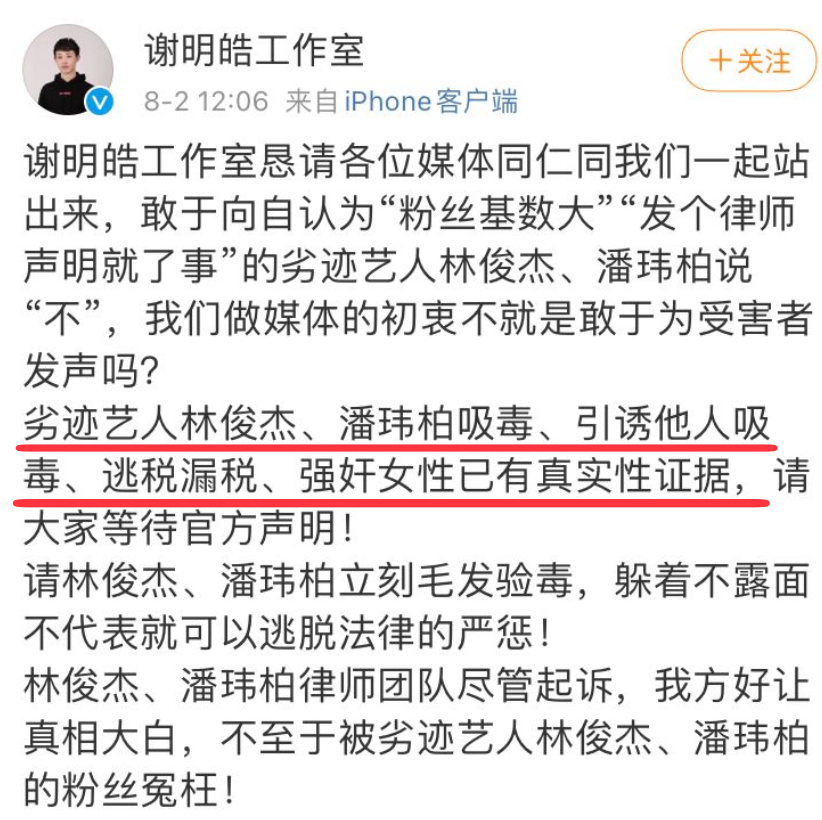 看到这里一定有人会问,谢明皓实名举报林俊杰潘玮柏参与吴亦凡吸毒强奸幼女,他做这个事,能有什么好处吗?