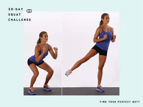 先做一组窄蹲,站立后将左脚向后踢,过程中记得全身都要用力。将腿收回后再做另一组窄蹲,之后将右脚后踢再收回,这样算一组。