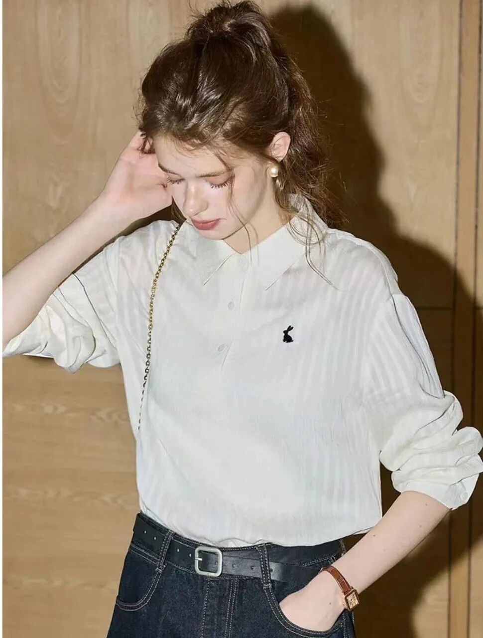 深蓝/米白两色都藏着巧思——胸前立体小兔刺绣软fufu的,像把秋天的灵动缝进了衣料;米白色款更绝,阳光一照,提花暗纹若隐若现,细腻得像在皮肤上画了层柔焦滤镜,质感直接赢很大!