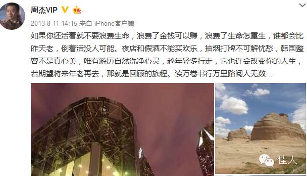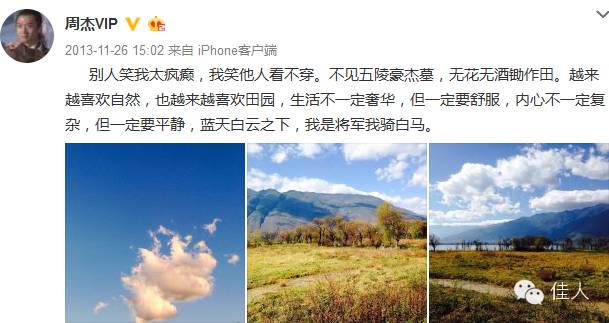 周杰是这句话的最好践行者。他一直称自己是“业余娱乐圈人”,三分之一的时间在娱乐圈,三分之二的时间分给别的,微博里满是行走记录。