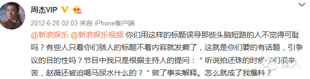 但节目出来,题目就成:周杰曝赵薇拍《还珠》喝马尿水,网友声讨周杰太不厚道。