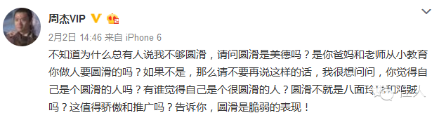 网友也建议他圆滑点,他回应:“不知道为什么总有人说我不够圆滑,请问圆滑是美德吗?圆滑不就是八面玲珑和鸡贼吗?这值得骄傲和推广吗?告诉你,圆滑是脆弱的表现! ”