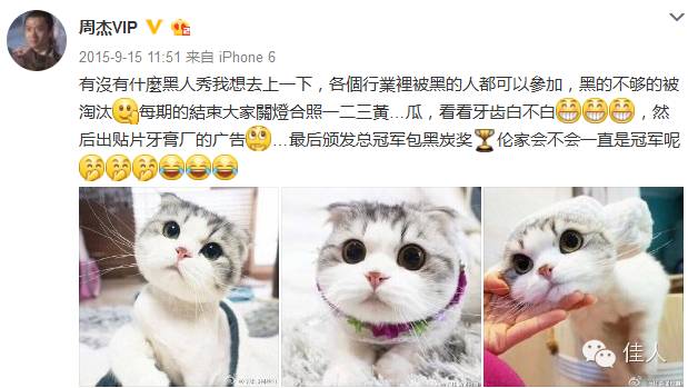 惯性被黑,也是无奈,“有没有什么黑人秀我想去一下,最后颁发总冠军包黑炭奖”,还配上超萌猫咪照。