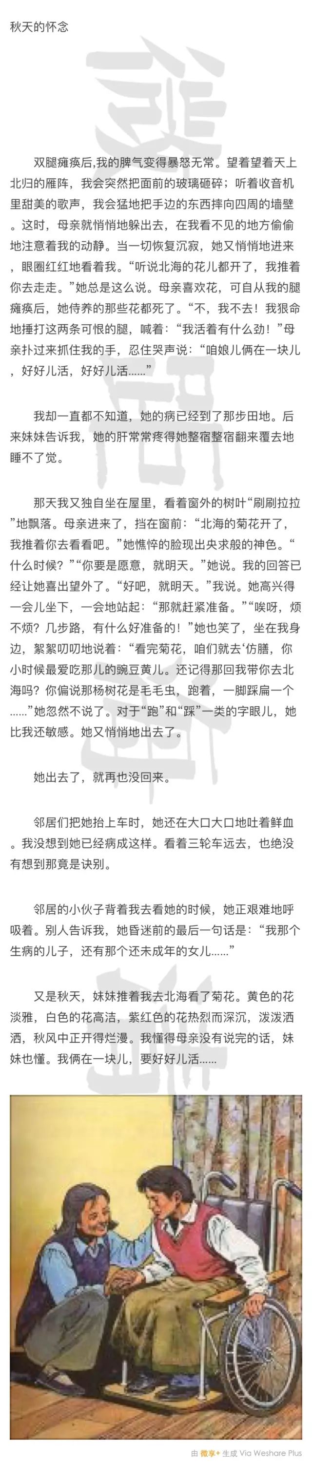 秋天不仅仅是丰收的季节,也是落叶飘零、秋风萧瑟的季节。在秋天,史铁生先生送别了自己的母亲,在一种意想不到的情况下,突然间就迎接了这巨变来临。这也提醒我们所有人,时光如梭,千万不要因为一时的意气之争,给人生留下无法弥补的悔恨。希望“假如当时我……”这句话,不属于我们每一个人,我们都要——好好活。