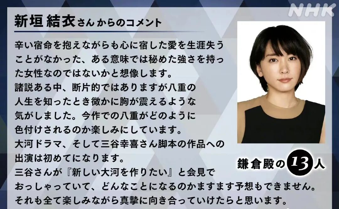 这是新垣首次出演大河剧,将饰演北条义时(小栗旬饰)的初恋情人「八重」,也被称为“伊豆第一美女”。
