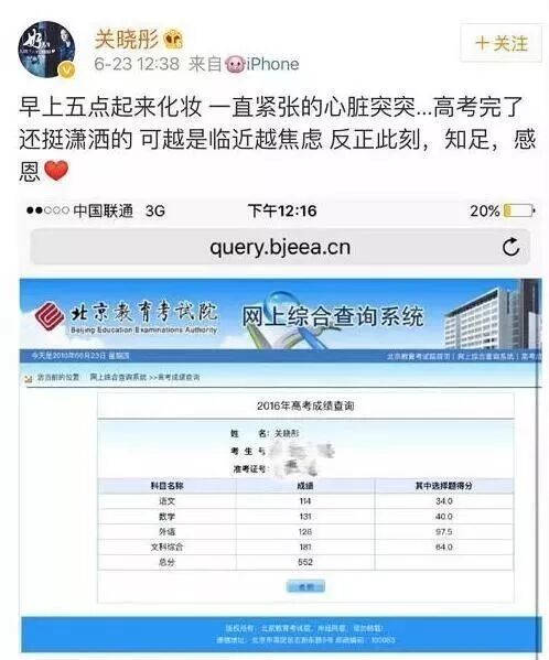 在关晓彤的微博中,她还经常晒自己的成绩单。