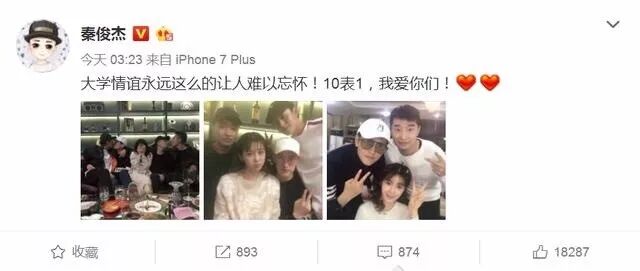 其实单看发的微博动态并没有什么问题,上面写到:大学情谊永远这么的让人难以忘怀!10表1,我爱你们!然后配了三张图片,其中就有秦俊杰作势要去亲吻一旁的男同学,让网友们直呼辣眼睛!