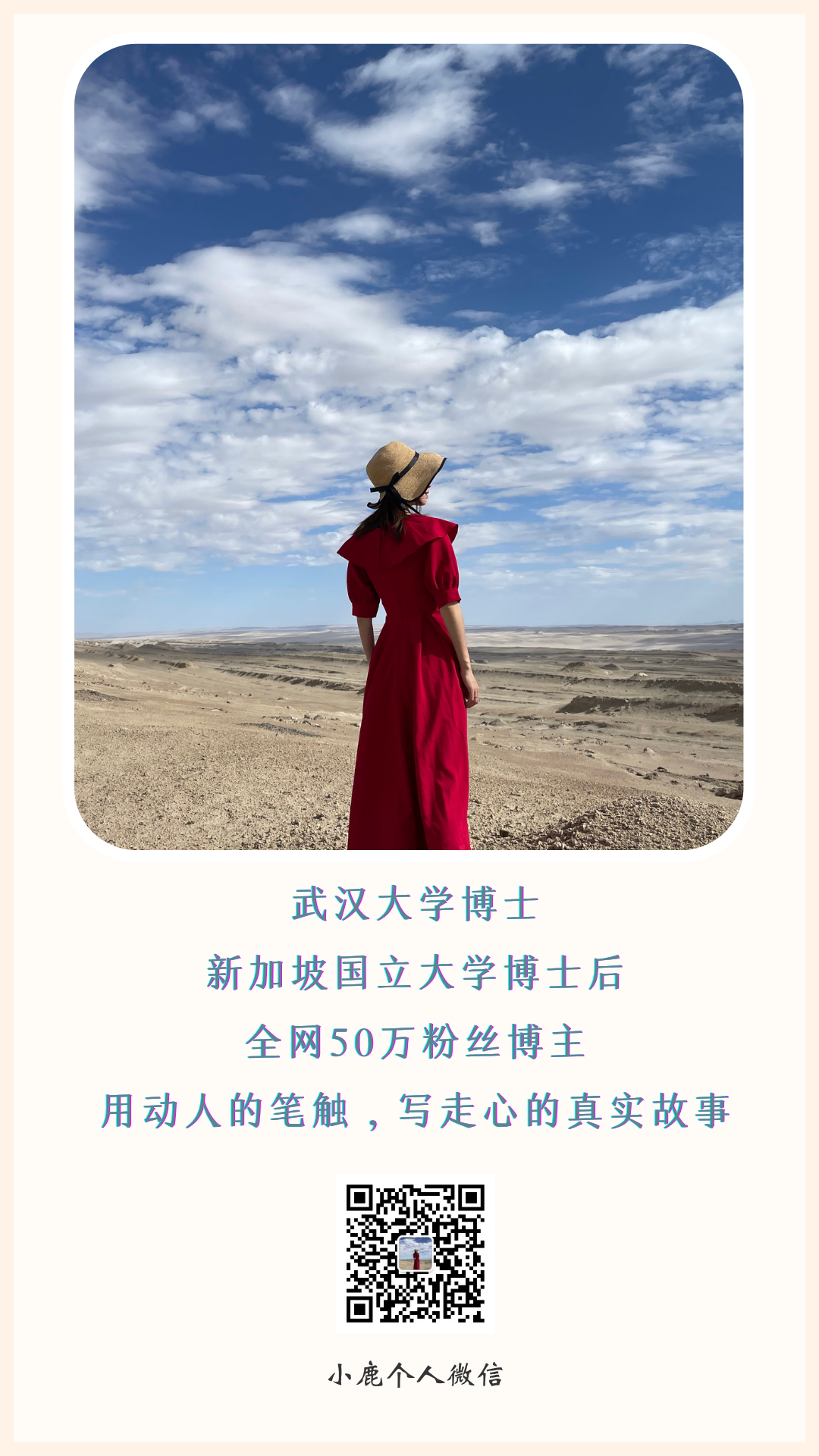 武汉大学生物化学与分子生物学专业博士,新加坡国立大学(NUS)博士后,一门心思搞科研,业余写稿不荒废,努力给你惊喜。小鹿私人微信:xiaolu6908