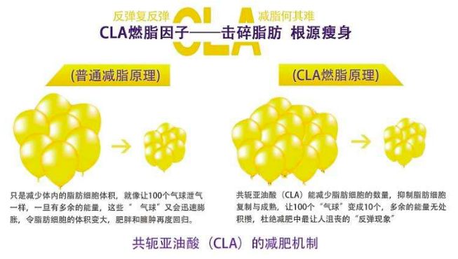 还有研究报告指出,CLA可以避免减肥者出现减而复胖,胖而复减的恶性循环中,是一种天然有效的减肥成分。