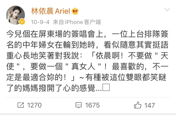 正如11年前的签唱会上,一位中年阿姨对林依晨说的那样,