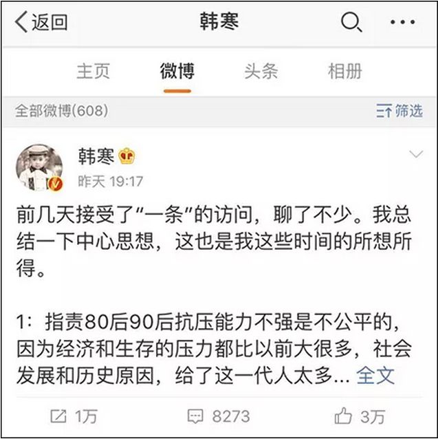 @杨恕JW:以前的我喜欢以前的韩寒,现在的我喜欢现在的韩寒。