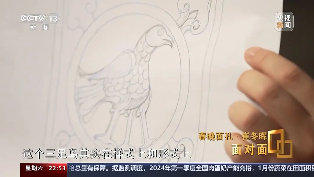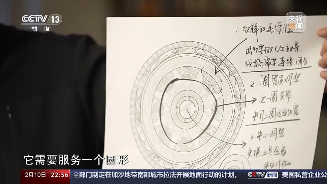 从博物馆文物原型,到图案提取,到绘制电子设计图,再到常沙娜逐一手绘修改,历经3个月的多次打磨后,创意节目《年锦》中各个朝代的主视觉图案一一敲定。
