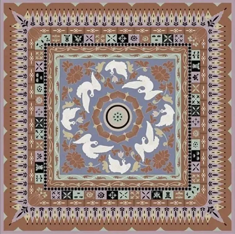 1952年,21岁的常沙娜为亚洲及太平洋区域和平会议设计了一款“和平鸽”真丝丝巾。她采用了敦煌隋代石窟藻井的形式,上面穿插和平鸽图案。