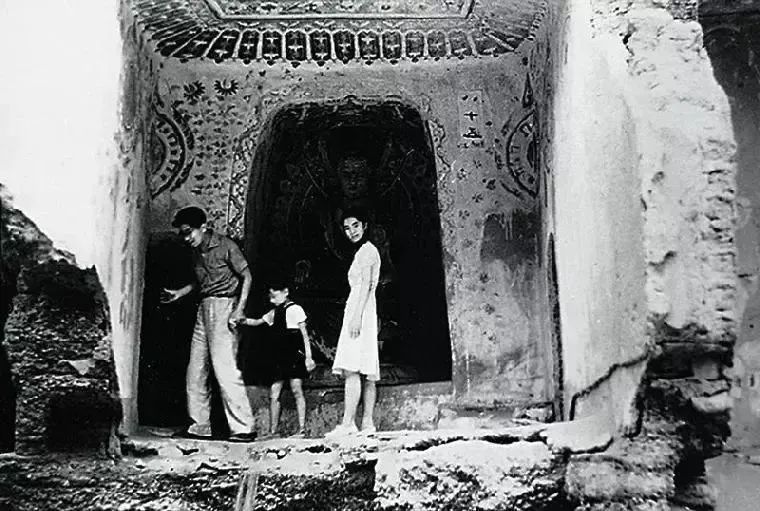 常书鸿带着自己两个孩子沙娜(右)和嘉陵在莫高窟洞窟内。