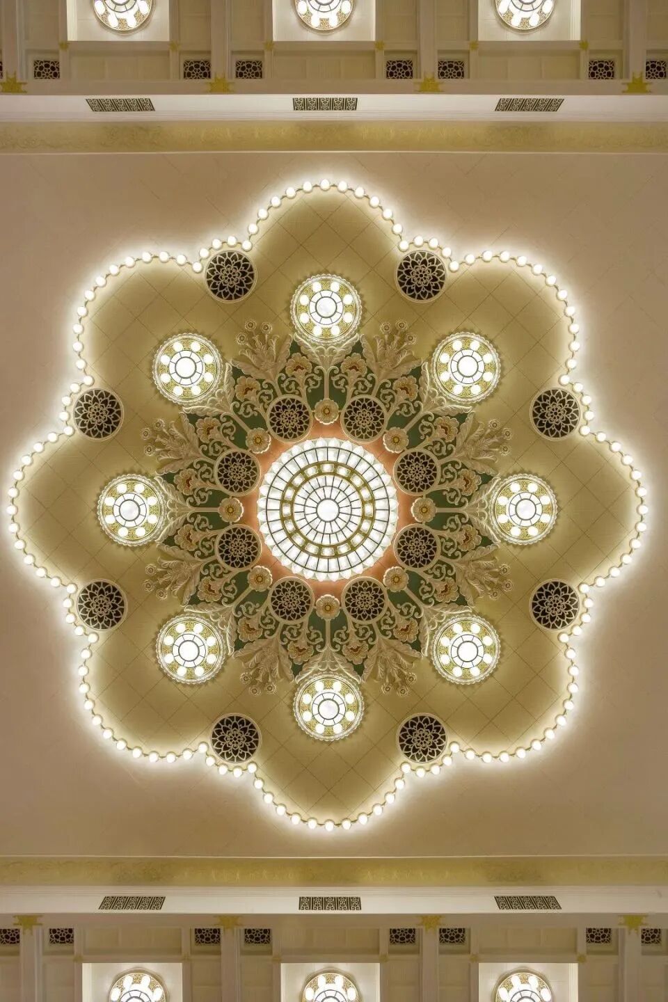 受敦煌壁画里的藻井图案启发,她在天顶正中设计了一朵唐代风格的、由花瓣构成的圆形浮雕大花。如今,这朵来自敦煌的花依然在人民大会堂宴会厅的顶上熠熠生辉。