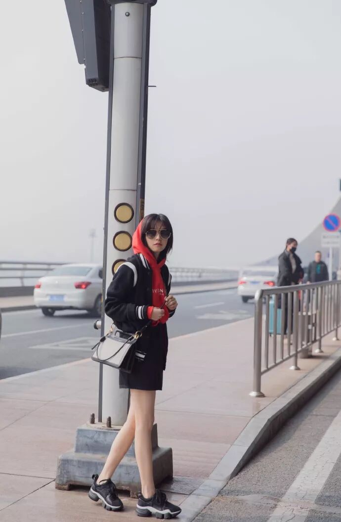 ▲在出发去大秀时,春夏身着Givenchy黑色棒球衫内搭字母印花红色帽衫,下搭黑色牛仔半裙、黑色Jaw Sneaker运动鞋以及黑灰拼色WHIP手袋,红黑配色的全身造型活力亮眼。