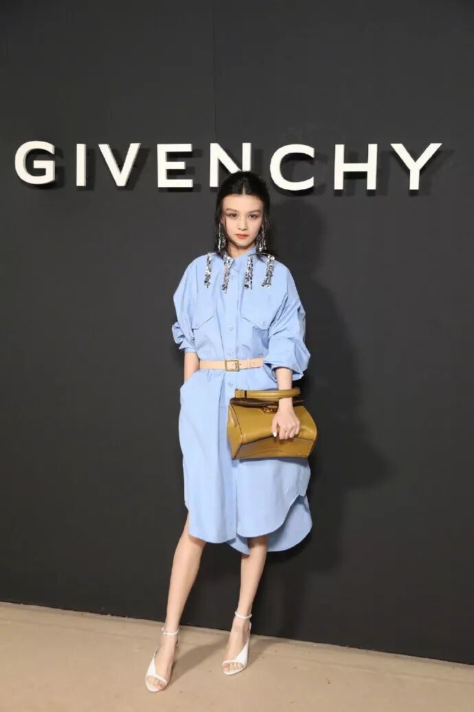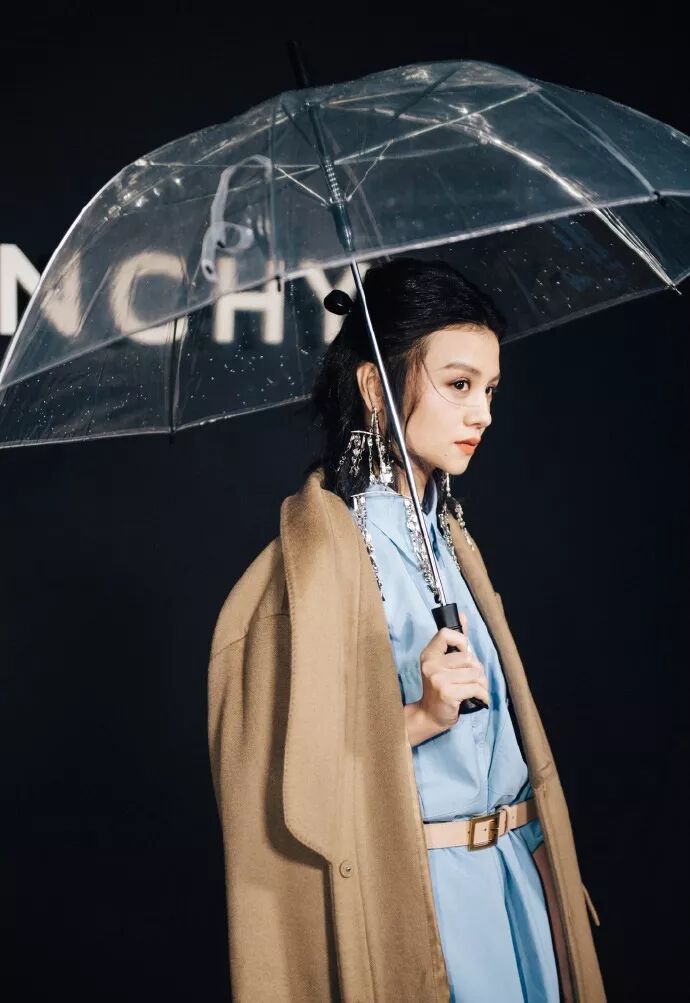 ▲身着Givenchy 2019早秋系列的春夏,以蓝衬衣裙搭配复古银色吊坠耳环,外搭驼色大衣温婉优雅。