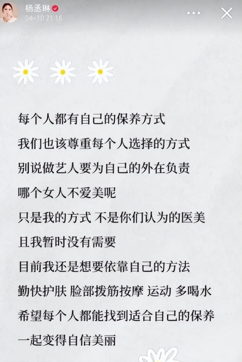 从杨丞琳的回复中不难感觉到,她对于屡次被传整容是很无奈的。不过,这次辟谣她也顺带公开自己的保养方式。她坦言,出道至现在除了牙齿有进行矫正之外,其他的地方都没有动过,连保养针都没有打过一支。杨丞琳表示,自己的保养方式就是运动按摩脸部拔筋,多喝水,希望大家用最适合自己的方式保养。