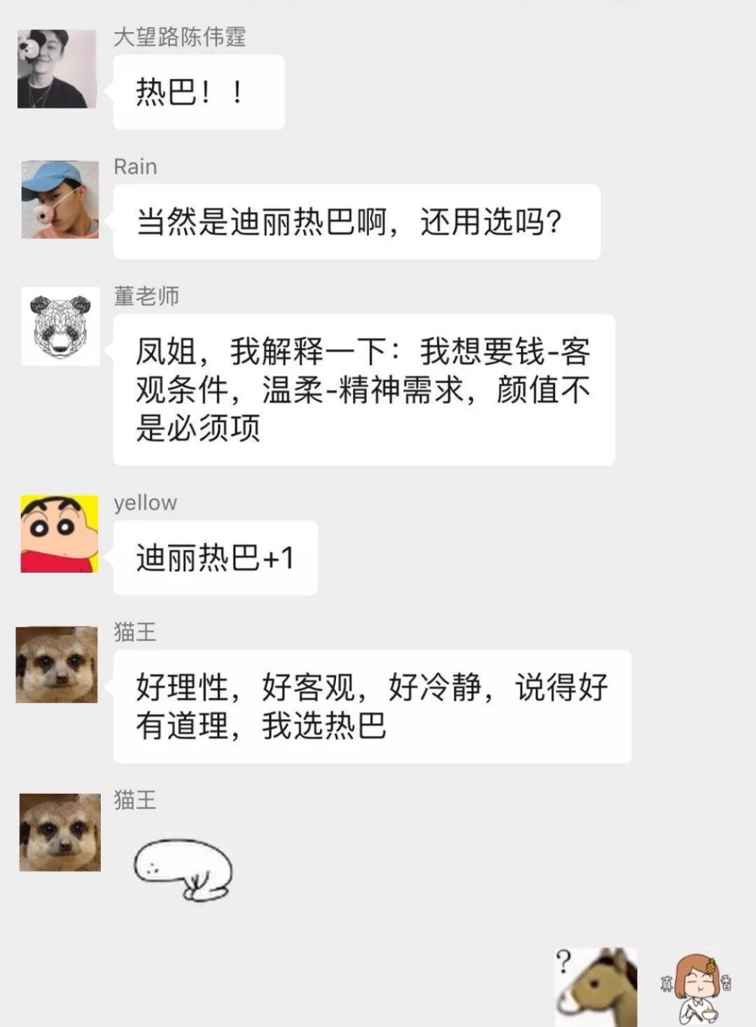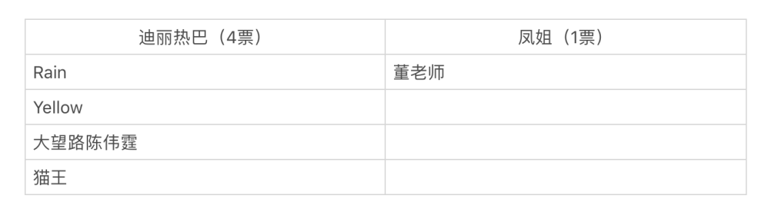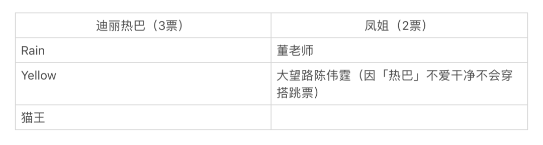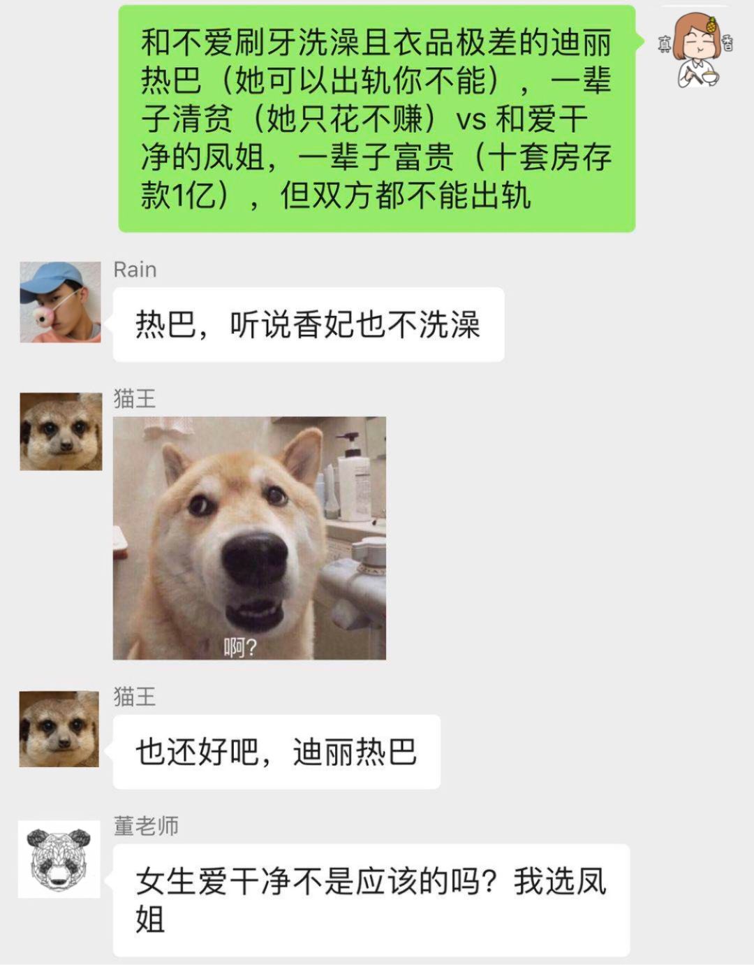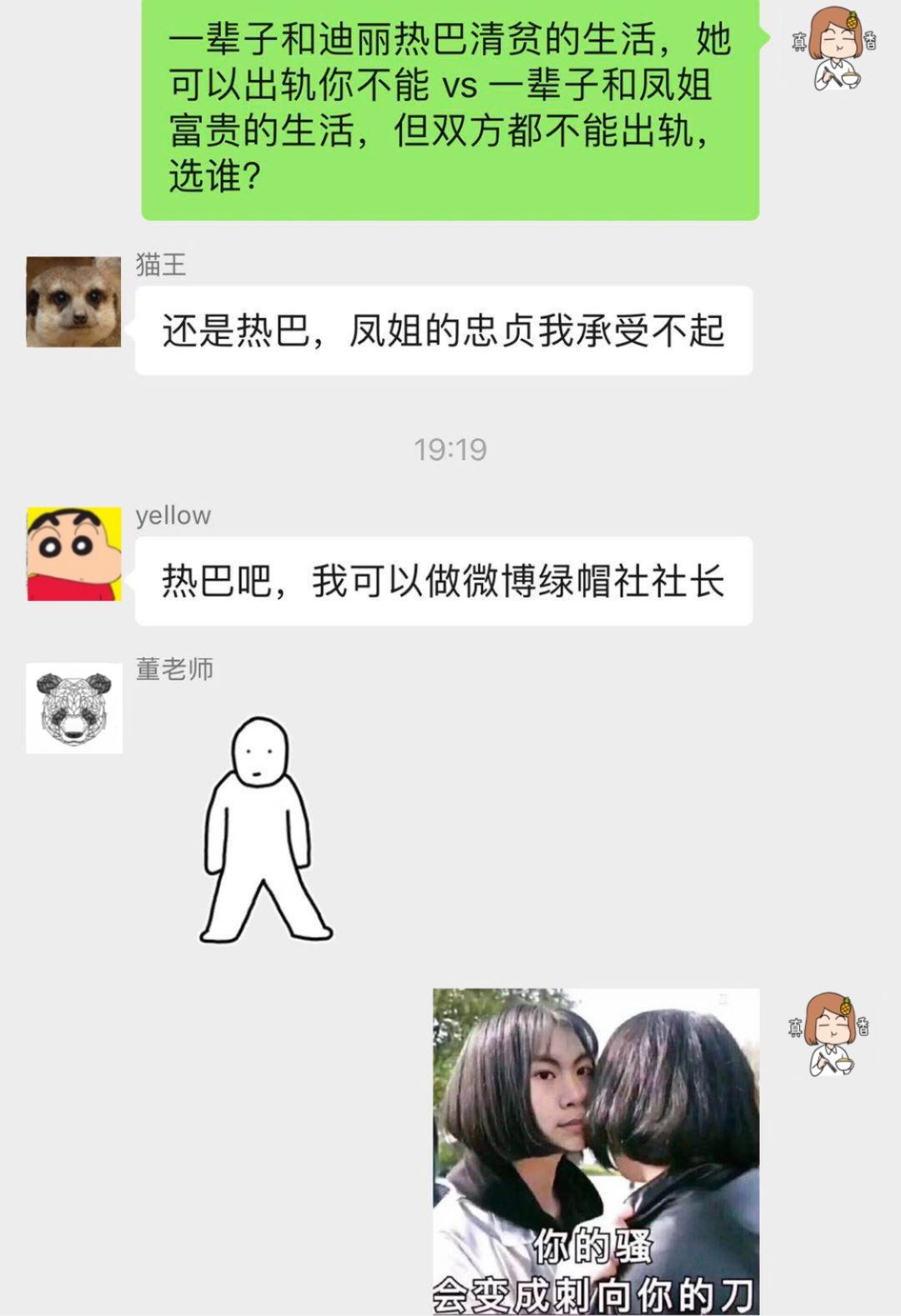 本来在第三轮的问答中,我曾加了一个码「聪明能干的凤姐和蠢蠢笨笨的迪丽热巴」,结果男生纷纷倒戈迪丽热巴,导致问答一度进行不下去,男生的理由也很简单:女生太过聪明能干直接劝退。