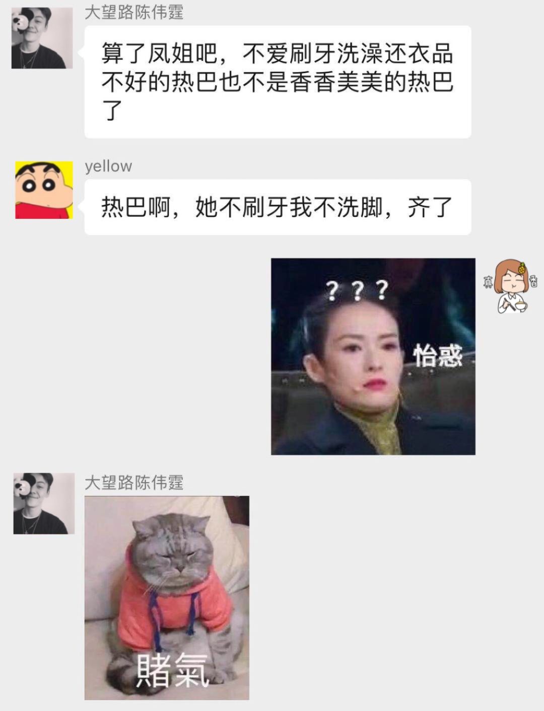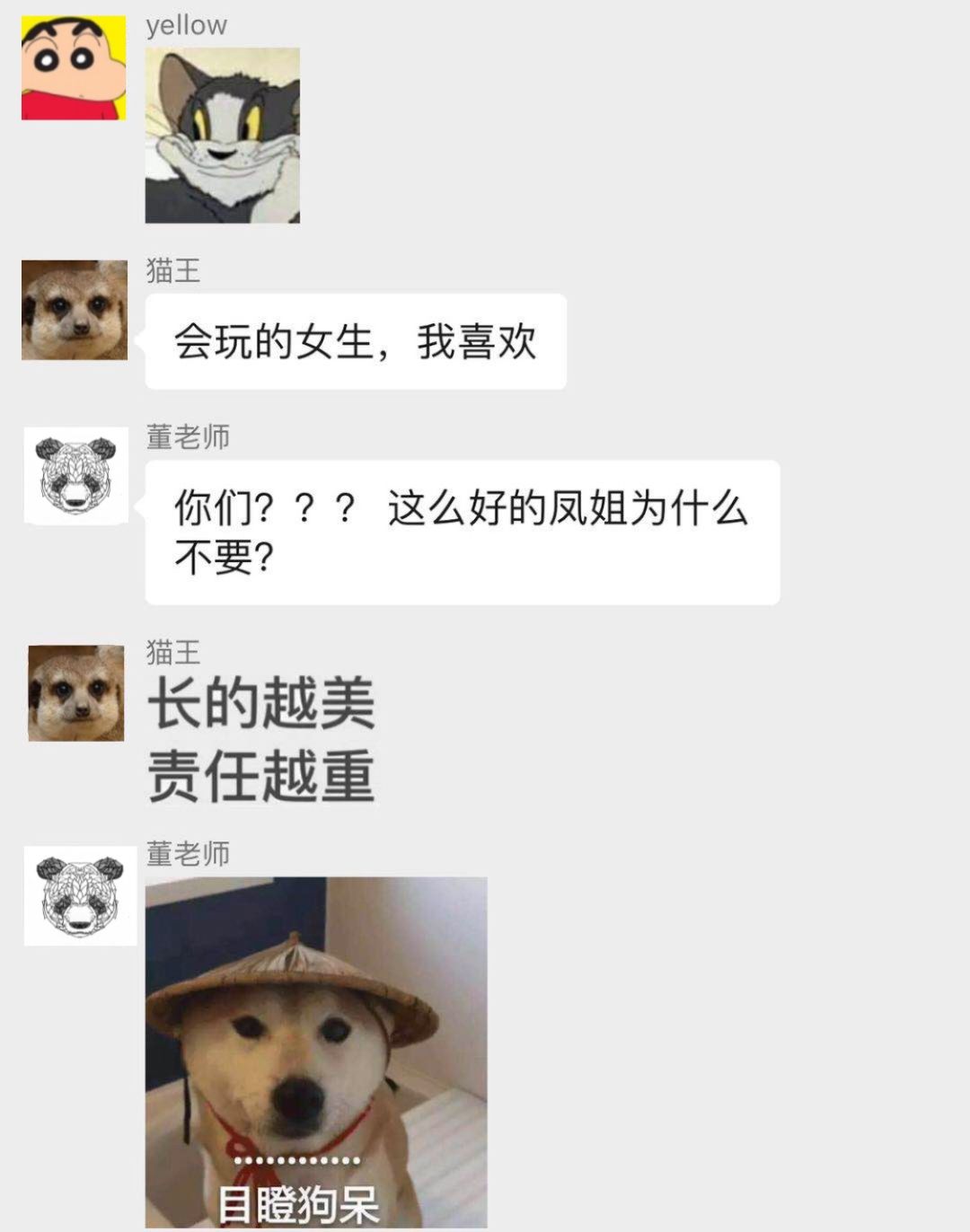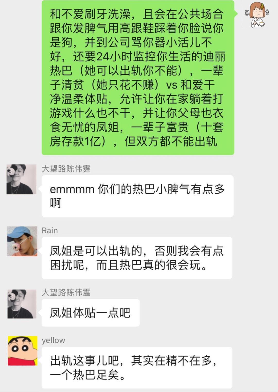 本来在第三轮的问答中,我曾加了一个码「聪明能干的凤姐和蠢蠢笨笨的迪丽热巴」,结果男生纷纷倒戈迪丽热巴,导致问答一度进行不下去,男生的理由也很简单:女生太过聪明能干直接劝退。