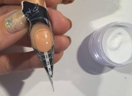 在指甲面覆盖一层白色晶粉。