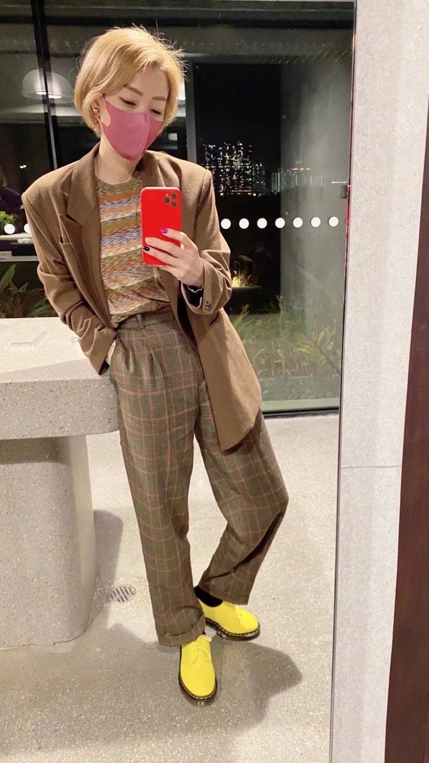 Sammi的私服有很多都是西装,像这套就很有学院风即视感,需要注意加上一条同色系领带,再戴上黑镜框的眼镜,知识分子的气质瞬间被拉满。