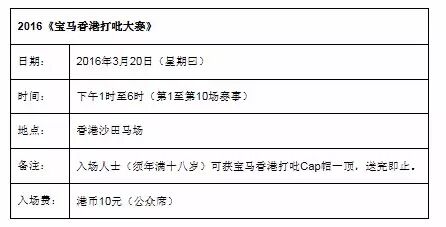 香港2016年3月9日电 /美通社/ -- 《宝马香港打吡大赛》连续第四年由著名汽车品牌宝马香港冠名赞助,今年将于3月20日在香港沙田马场隆重上演,此项只限四岁马匹参与的赛事,由 14 匹精英赛驹在草地跑道竞逐途程2000米、奖金1800万港元,被誉为“四岁功名.一生一次”的冠军殊荣。