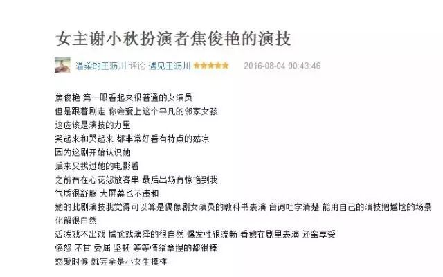 和现在大多数无演技的艺人的“情绪不到,表情现行”强迫咧嘴笑或哭不同,焦俊艳的每一场戏都是和角色的完美契合。
