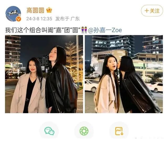 在三八妇女节这一天,高圆圆发文晒出了自己和好友孙嘉一的街拍照片,配文称这个组合为阖『嘉』团『圆』。照片中,她们俩在大街上尽情享受着亲密的时刻,而这样的真挚友情也让人为之感动。通过社交媒体发布这样的照片,不仅仅是为了展示她们之间的深厚情谊,更是在传递一种积极向上的友情观念,这对于社会的正能量传播有着积极的意义。