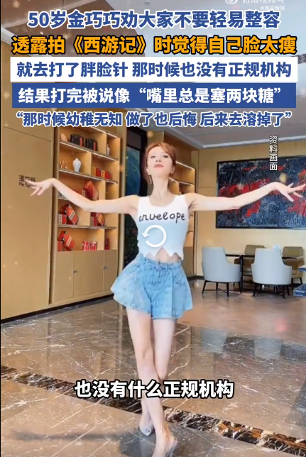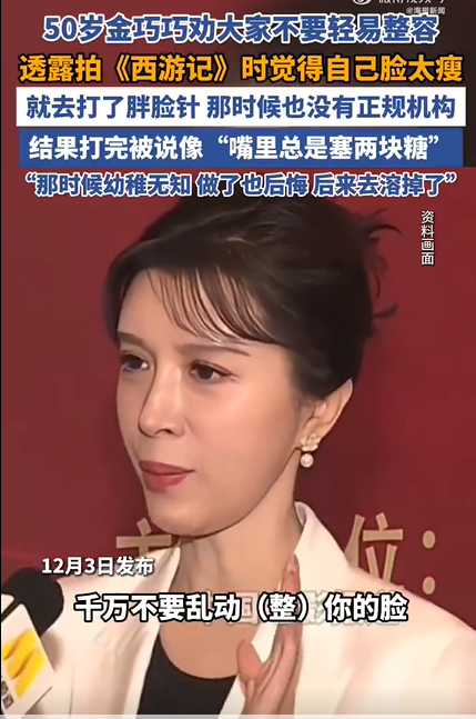 50岁知名演员金巧巧被问及保养秘籍时直言:“千万不要乱动你的脸,一定要尽量保持原生的、自然的才是最好。” 更直言当初拍摄《西游记续集》的时候,嫌太瘦,去打了‘胖脸针’。“好多网友就聊,为什么她的脸上老像塞了两块糖。”