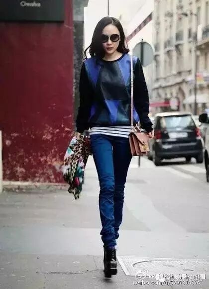 廓型卫衣套条纹衫搭配牛仔裤,一看就知道她喜欢欧美高街风。