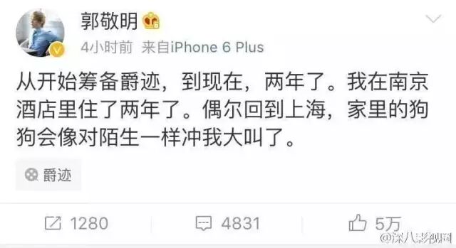 郭敬明在微博中称,自个为拍照《爵迹》定居南京的酒店2年,偶尔回上海的家,竟被爱犬当陌生人吠。真是让人闻者流泪,见者伤心,当然,这也不能怪爱犬,爱犬的心里肯定是这么的:少小离家老大回,安能辩你是雌雄?怪我咯?