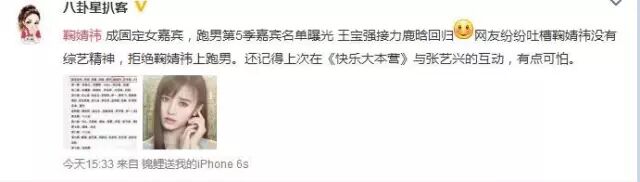 而这次热搜是因为《跑男5》,很早之前就有传言称鞠婧祎将替代Angelababy出演,鹿晗则将由王宝强顶替。这几天,这一新闻又被不少营销号拿出来溜,并称已经得到证实。